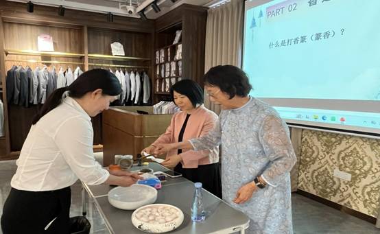 本次活動(dòng)特邀非遺企業(yè)廣州市老山香業(yè)貿(mào)易有限公司的莊老師和周老師進(jìn)行現(xiàn)場教學(xué)。老師們系統(tǒng)介紹了香道文化的歷史脈絡(luò)與精神內(nèi)涵,闡述了香道與“衣食住行”、中醫(yī)藥、美學(xué)文化及個(gè)人修養(yǎng)的密切聯(lián)系,并重點(diǎn)講解了宋代篆香的文化淵源與操作禮儀。